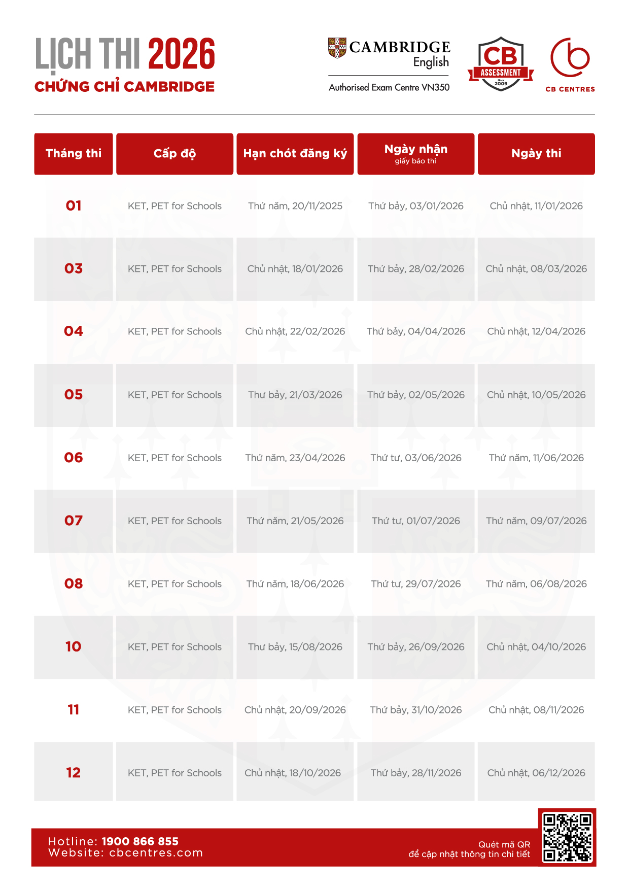 Hệ thống CB Centres- Trung tâm khảo thí ủy quyền VN350 của Hội đồng khảo thí tiếng Anh Đại học Cambridge (Anh quốc) là đơn vị khảo thí uy tín, thường xuyên tổ chức các kỳ thi lấy chứng chỉ quốc tế Cambridge.